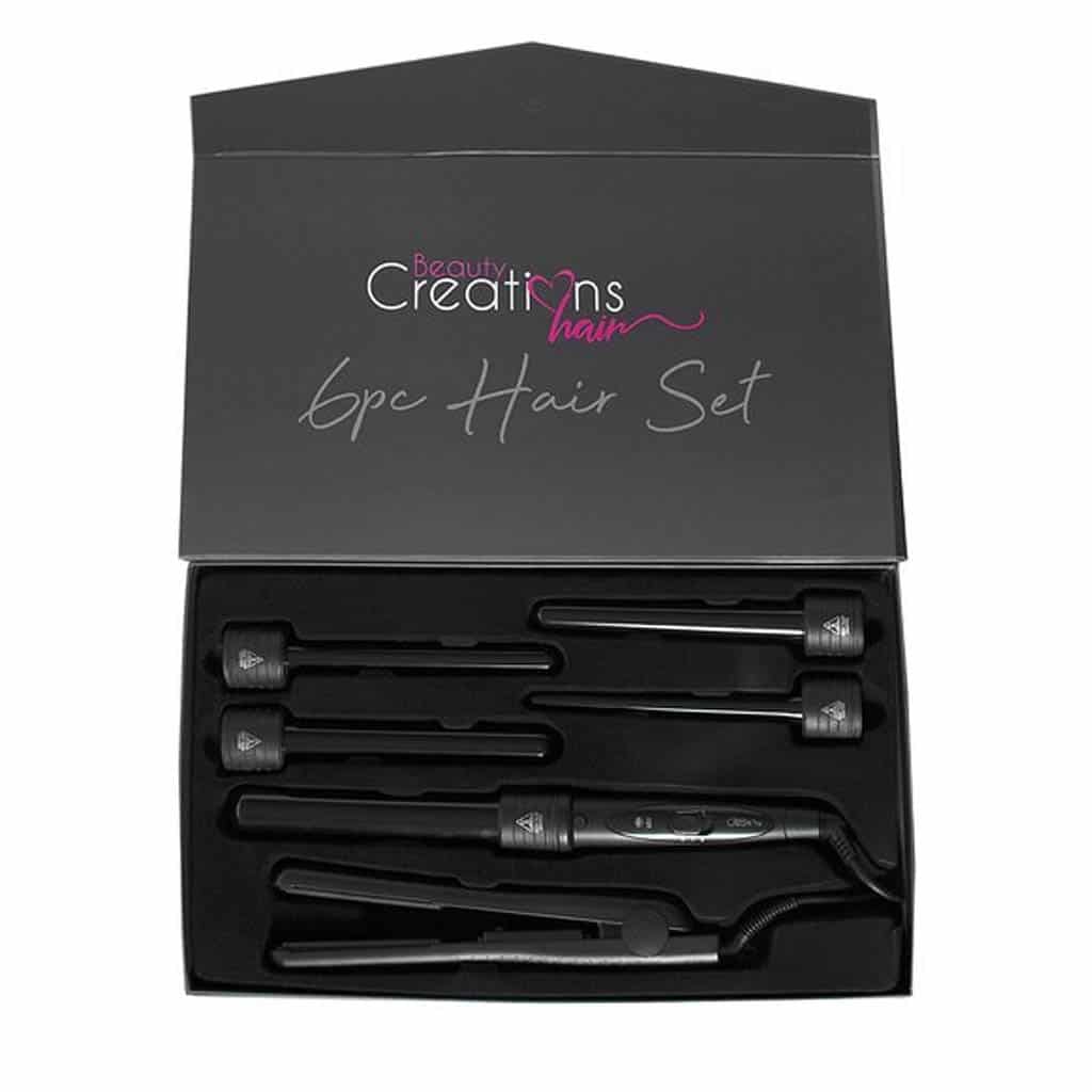 El juego de cabello de 6 piezas incluye 5 rizadores intercambiables + una plancha.  Los barriles de teflón sin clip crean rizos brillantes sin tirar ni romper el cabello.  Dos configuraciones de temperatura que alcanzan hasta 400F.