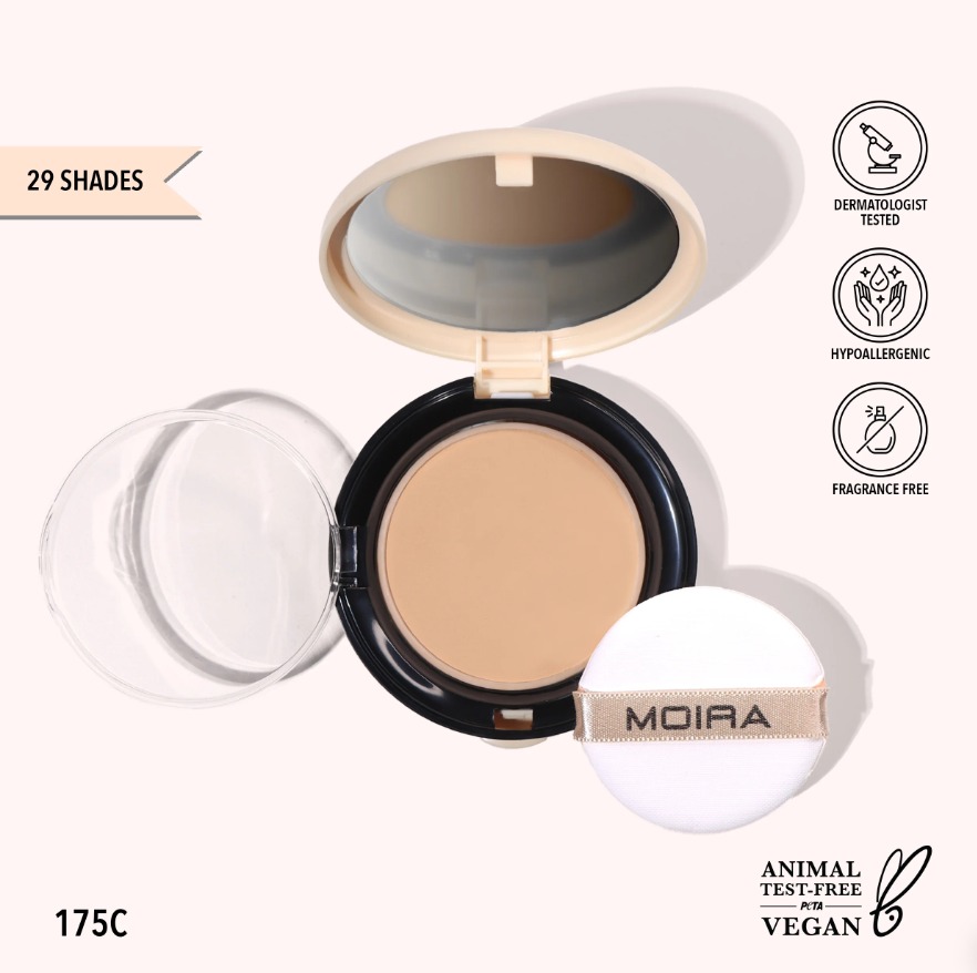 MOIRA Complete Wear™ Powder Foundation es una cobertura de medio a total construible con un acabado mate natural. Con hialuronato de sodio, alantoína, escualano vegano, aloe vera y extracto de camelia, esta base en polvo liviana no comedogénica hidrata la piel mientras permanece quieta durante todo el día. Además, absorbe el exceso de sebo y oculta imperfecciones, líneas finas y poros.